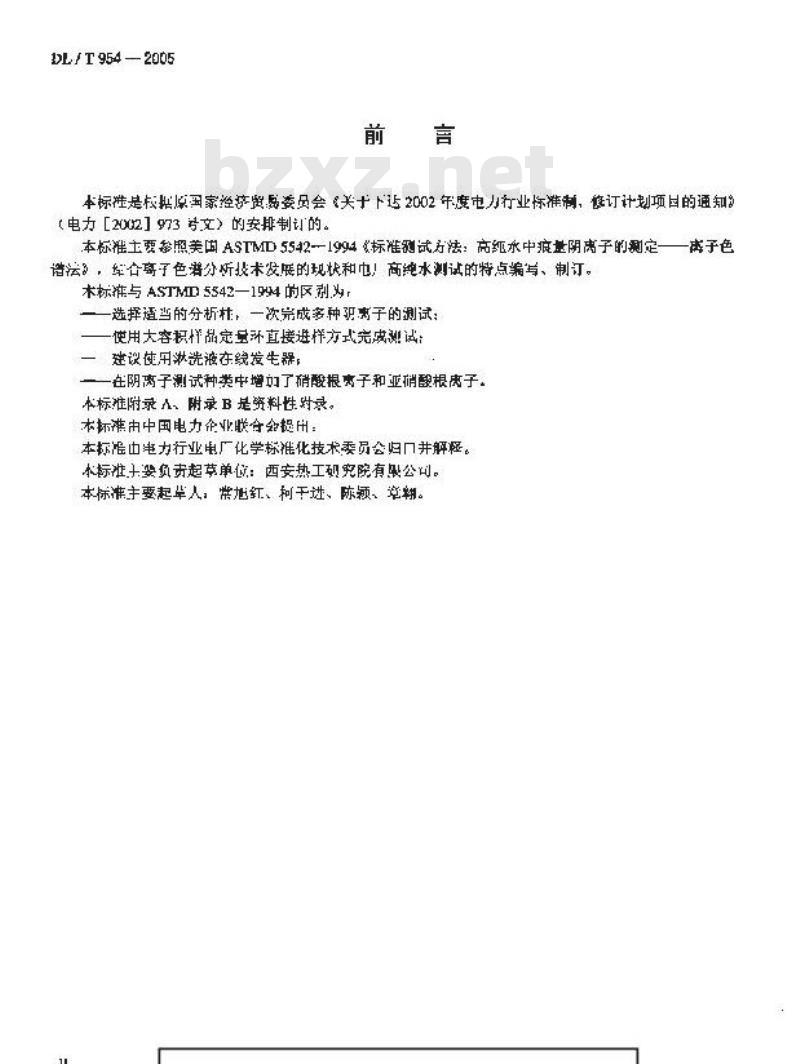本标准是板据原国家经济贸感委员会关十下运2002年度电行业标准制,修订计划项国的通知(电力[20X2】973号文》的安排制计的。本标准主要参照美国ASTMD55421994《标准测试行法:高死水中痕量阴离子的测定—离子色谐法,军合子色潜分所技末发展的现快和电!高纯水测试的特点编写、制订。本标准与ASTMT5542一1994的区剂.选择适当的分析柱,一次完成多种羽离子的测试;使用大容提样品定量环直接进样方式完皮试一建议使用淋选滤在线发生器,一在阴离子测试种类中增妇了梢酸根变子和亚滑龄根患子。本标准附录A、附录B是资料性对录。本标摊由中国电力企业联全会提用:本标准由电力行业电厂化学标化技术委员会归口并解轻。标准十要负责起草单位:西安热工列究院有公司。本标准主要起革人,常旭红、柯干进、陈题、章朝。火力发电广水汽试验方法bzxz.net