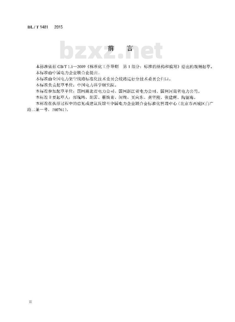 本标准依据GB1.1—2009《标准化[.作导则本标准由中国电力企业联合会提山:第1部分:标准的结构和编写》给出的规则起草。本标准由全|用电力架学线路标准化技术委员会线路运行分技术委员公归口。标准负货起节单位:中电力科学研究院。本标淮参加起节单位:国网湖北省电力公司、国网渐江省电力公司、国网河南省电力公司。本标淮要起节人:邵瑰玮、甜露、蔡焕青、闵绚、吴向东、龚竖刚、张建辉、附留海本标准在执行过程中的意见或建议反馈中国电力企业联介会标准化管理中心(北京市西城区门广路条一号,100761)