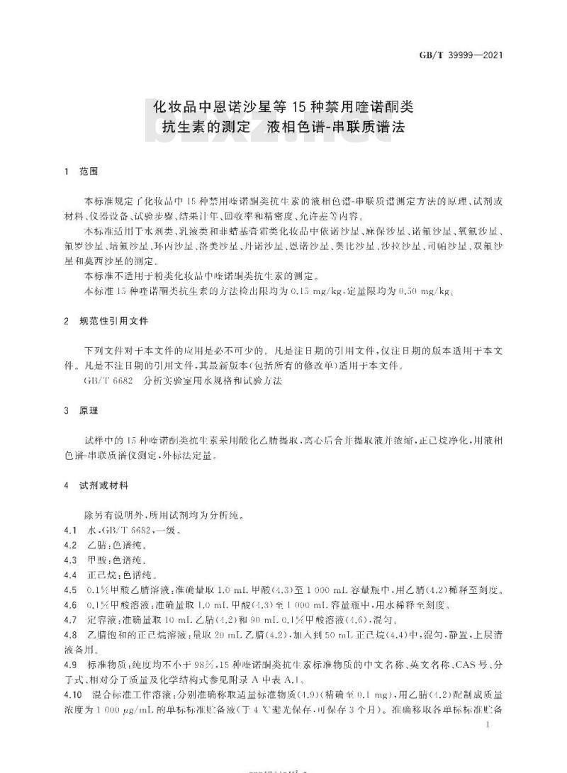 - GB/T 39999-2021 化妆品中恩诺沙星等15种禁用喹诺酮类抗生素的测定 液相色谱-串联质谱法