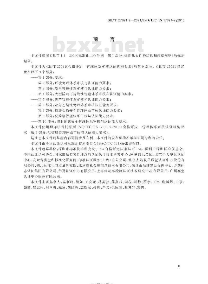 管理体系审核认证机构要求》的第9部分。GB/T27021已经第2部分:坏境管理体系审核与认证能力要求;第3部分:质量管理体系审核与认证能力要求;第4部分:大型活动可持续性管理体系审核和认证能力要求;一第5部分:资产管理体系中核和认证能力要求;一第6部分:业务连续性管理休系审核认证能力要求;第7部分:道路交通安全管现体系审核认证能力要求;第9部分:反贿赂管理体系审核与认证能力要求:第10部分:帜业健康安全管理体系中核与认证能力要求本文件使用翻译法等同采用IS0/IECTS170219:2016≤合格评定理体系中核认证机构要第9部分:反贴略管理体系审核与认证能力要求》求