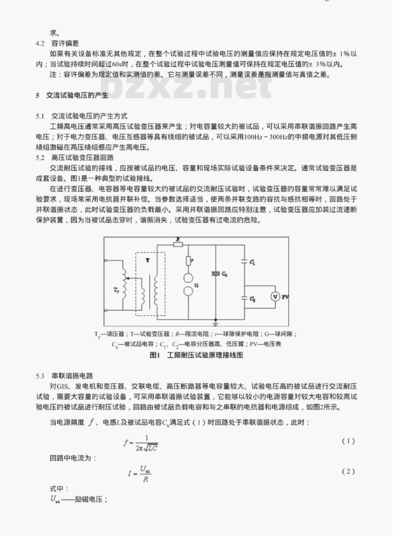 如果有关设备标准无其他规定,在整个试验过程中试验电压的测量值应保持在规定电压值的1%以内;当试验持续时间超过60s时,在整个试验过程中试验电压测量值可保持在规定电压值的±3%以内。注:容许偏差为规定值和实测值的差。它与测量误差不同测量误差是指测量值与真值之差5交流试验电压的产生