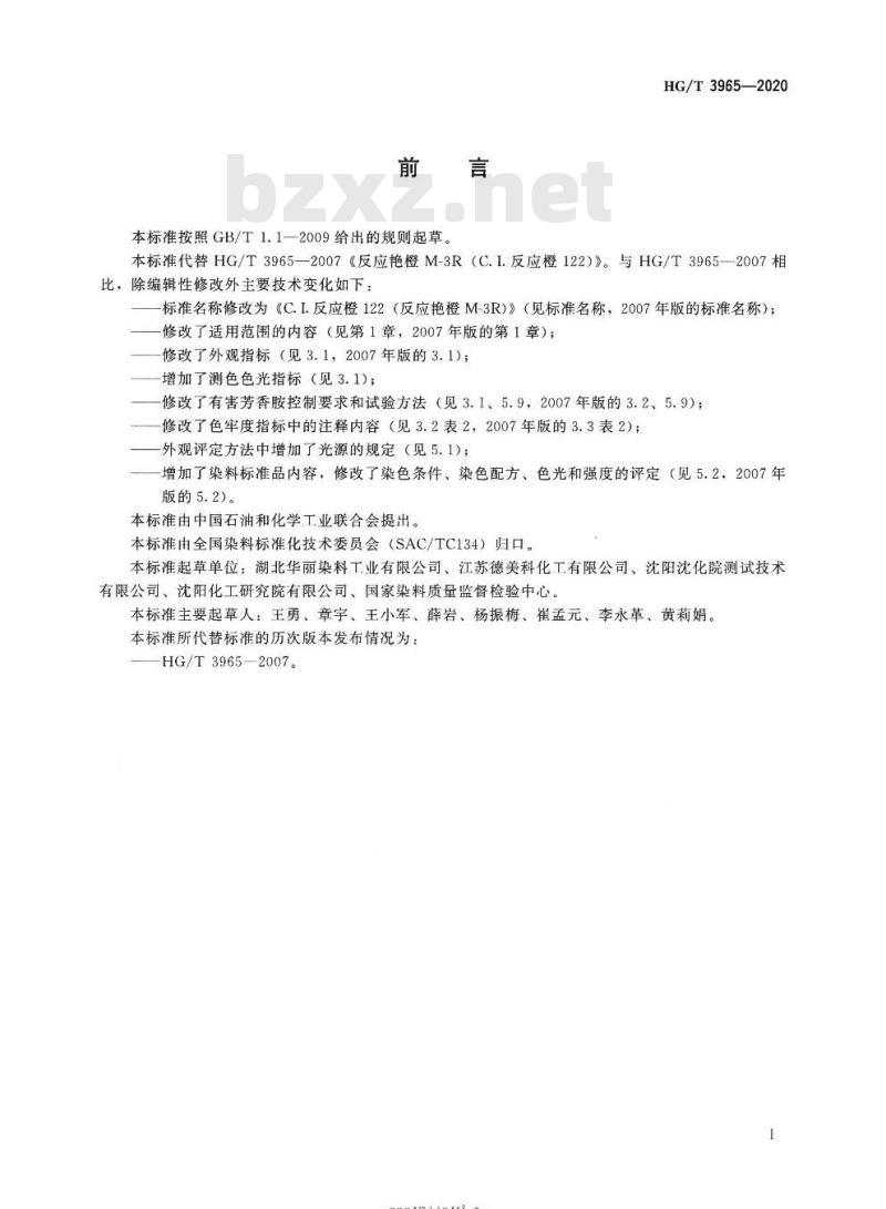 本标准代替HG/T3965—2007《反应艳橙M-3R(C.I.反应橙122)》。与HG/T3965—2007相比,除编辑性修改外主要技术变化如下:标准名称修改为《C.I.反应橙122(反应艳橙M-3R)》(见标准名称,2007年版的标准名称);-修改了适用范围的内容(见第1章,2007年版的第1章);修改了外观指标(见3.1,2007年版的3.1);增加了测色色光指标(见3.1);修改了有害芳香胺控制要求和试验方法(见3.1、5.9,2007年版的3.2、5.9);—修改了色牢度指标中的注释内容(见3.2表2,2007年版的3.3表2);外观评定方法中增加了光源的规定(见5.1);一增加了染料标准品内容,修改了染色条件、染色配方、色光和强度的评定(见5.2.2007年版的5.2)。