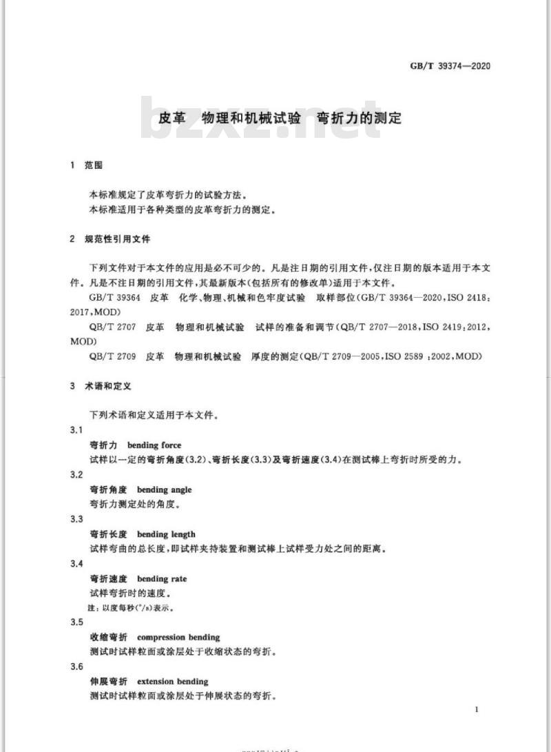 - GB/T 39374-2020 皮革 物理和机械试验 弯折力的测定