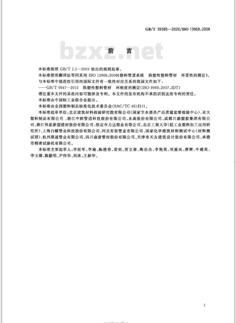 本标准按照GB/T1.1一2009给出的规则起草。GB/T39385-2020/IS013968:2008本标准使用翻译法等同采用ISO13968:2008塑料管道系统热塑性塑料管材环柔性的测定》。