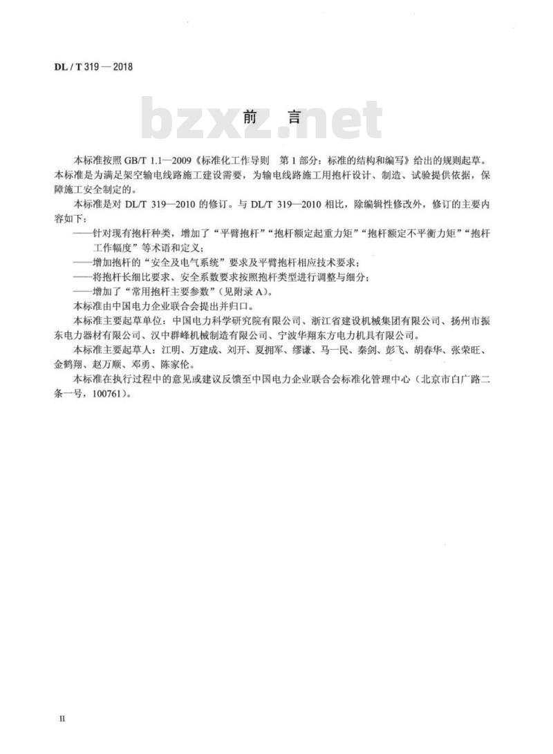 -增加抱杆的“安全及电气系统”要求及平臂抱杆相应技术要求;一将抱杆长细比要求、安全系数要求按照抱杆类型进行调整与细分;-增加了“常用抱杆主要参数”(见附录A)。本标准由中国电力企业联合会提出并归口。本标准主要起草单位:中国电力科学研究院有限公司、浙江省建设机械集团有限公司、扬州市振东电力器材有限公司、汉中群峰机械制造有限公司、宁波华翔东方电力机具有限公司。本标准主要起草人:江明、万建成、刘开、夏拥军、缪谦、马一民、秦剑、彭飞、胡春华、张荣旺、金鹤翔、赵万顺、邓勇、陈家伦。本标准在执行过程中的意见或建议反馈至中国电力企业联合会标准化管理中心(北京市白广路二条一号,100761)。