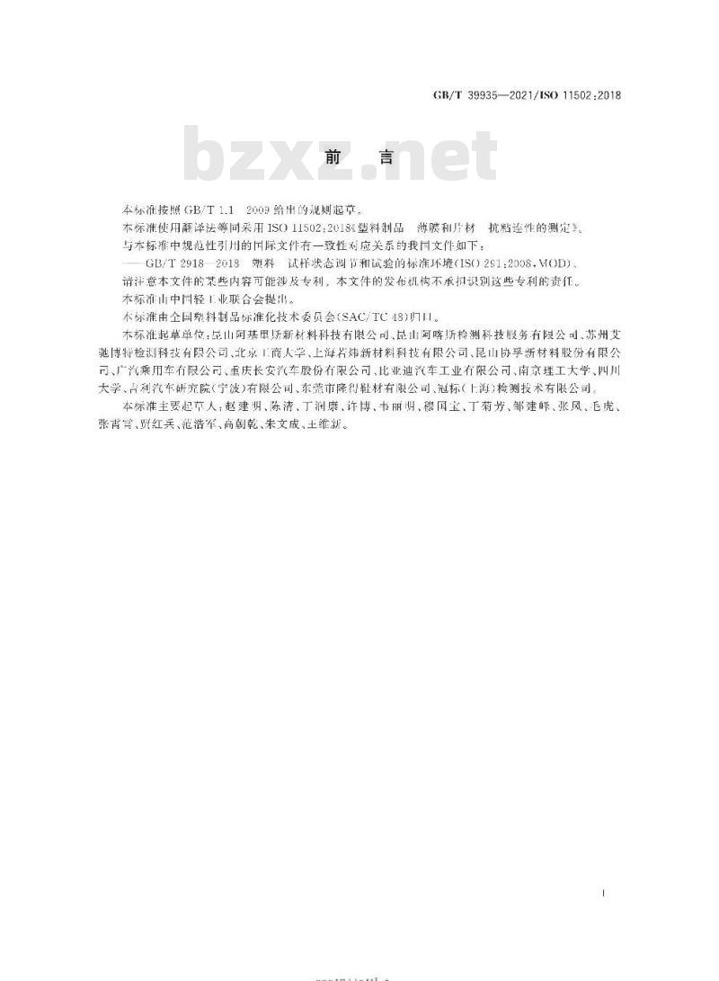本标准按照GB/T1.12009给出的规则起草。GR/T39935—2021/ISO11502:2018本标准使用翻译法等同采用IS011502:2018°塑料制品游和片材抗粘连性的测定》。与本标雅中规范性引用的国际文件有一致性对应关系的我国文件如下GB/T2918—2018塑料试样状态调节和试验的标准环境(IS()291:2008,MOD)请注意本文件的些内容可能涉及专利,本文件的发布机构不承扣识别这些专利的责任。本标准山中国轻业联合会提出。本标准由全国塑料制品标准化技术委员会(SAC/TC48)归本标准起草单位:昆山阿基单斯新材料科技有限公司昆山阿喀斯检测科技服务有限公司、苏州支驰博得检测科技有限公司、北京1商人学、上海君炜新材料科技有限公司、昆山协享新材料股份有限公市、广汽乘用车有限公司、重庆长安汽车股份有限公司、比业迪汽车工业有限公司、南京理工大学、四川大学,古利汽车研究院(宁波)有限公司、东莞市隆得鞋材有限公司、冠标(上海)检测技术有限公司。本标准主要起草人:赵建明、陈清、丁润康、许博、韦丽明、穆国宝、丁菊芳、邹建峰、张风、毛虎、张宵穹、贾红兵、范浩军、高朝乾、朱文成、土维新。rrKaeerkAca-