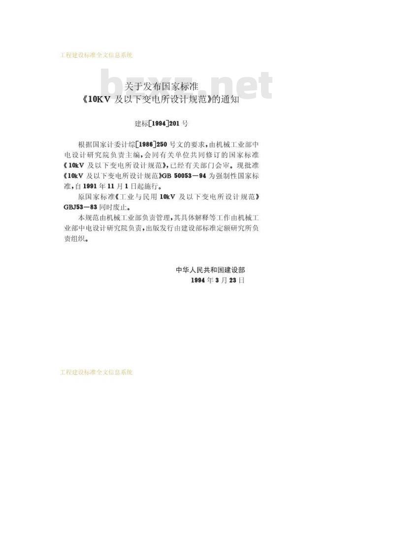 《10KV及以下变电所设计规范》的通知建标[1994]201号