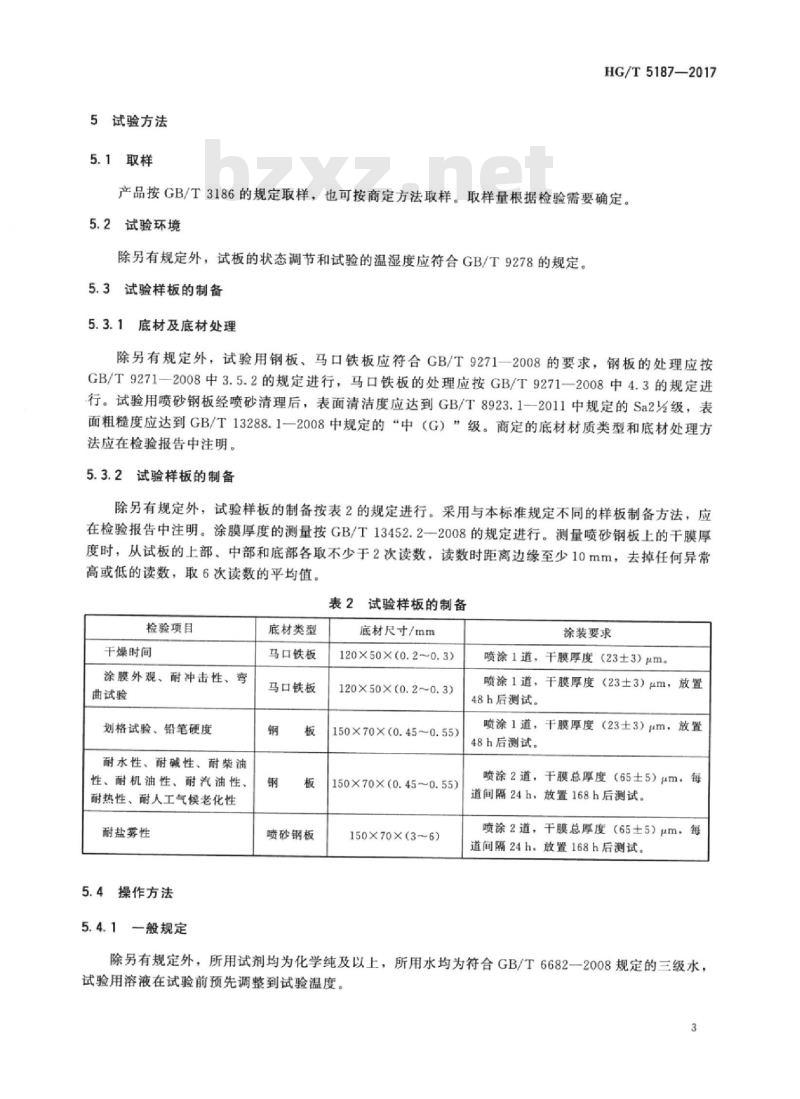 除另有规定外,试验样板的制备按表2的规定进行。采用与本标准规定不同的样板制备方法,应在检验报告中注明。涂膜厚度的测量按GB/T13452.2一2008的规定进行。测量喷砂钢板上的干膜厚度时,从试板的上部、中部和底部各取不少于2次读数,读数时距离边缘至少10mm,去掉任何异常高或低的读数,取6次读数的平均值。表2试验样板的制备