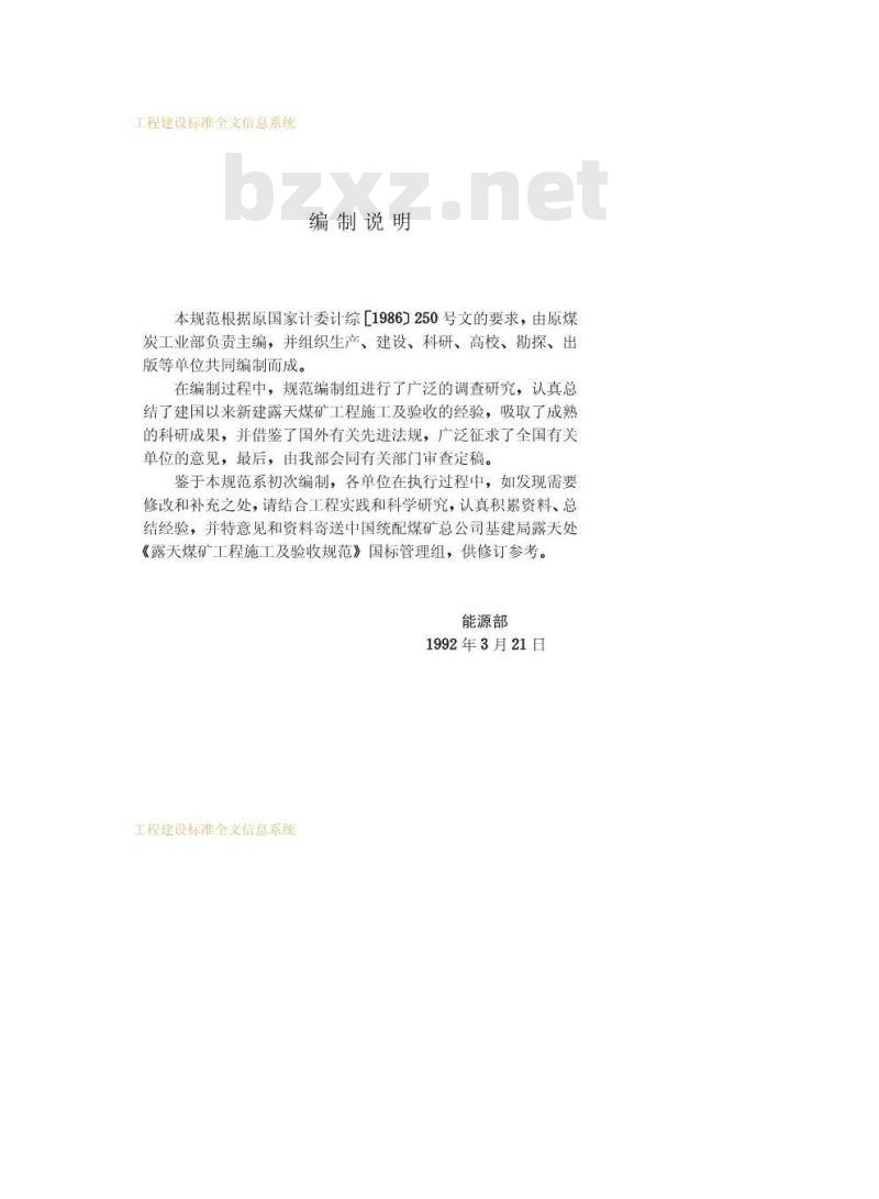 在编制过程中,规范编制组进行了广泛的调查研究,认真总结了建国以来新建露天煤矿工程施工及验收的经验,吸取了成熟的科研成果,并借鉴了国外有关先进法规,广泛征求了全国有关单位的意见,最后,由我部会同有关部门审查定稿。鉴于本规范系初次编制,各单位在执行过程中,如发现需要修改和补充之处,请结合工程实践和科学研究,认真积累资料、总结经验,并特意见和资料寄送中国统配煤矿总公司基建局露天处《露天煤矿工程施工及验收规范》国标管理组,供修订参考。能源部