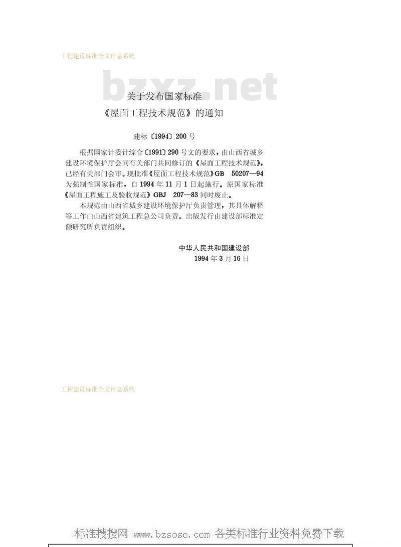 根据国家计委计综合【1991]290号文的要求,由山西省城乡建设环境保护厅会同有关部门共同修订的《屋面工程技术规范》,已经有关部门会审。现批准《屋面工程技术规范》GB50207—94为强制性国家标准,自1994年11月1日起施行。原国家标准《屋面工程施工及验收规范》GBJ207—83同时废止。本规范由山西省城乡建设环境保护厅负责管理,其具体解释等工作由山西省建筑工程总公司负责。出版发行由建设部标准定额研究所负责组织。