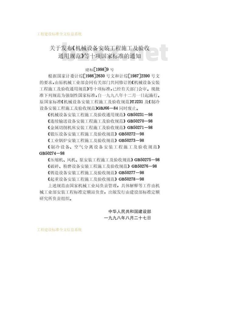 根据国家计委计综[1986]2630号文和计综[1987]2390号文的要求,由原机械工业部会同有关部门共同修订的《机械设备安装工程施工及验收通用规范》等十项标准,已经有关部门会审。现批准下列规范为强制性国家标准,自一九九八年十二月一日起施行。原国家标准《机械设备安装工程施工及验收规范》TJ231及《制冷设备安装工程施工及验收规范》GBJ66一84同时废止。《机械设备安装工程施工及验收通用规范》GB50231一98《连续输送设备安装工程施工及验收规范》GB50270-98《金属切削机床安装工程施工及验收规范》GB50271一98《锻压设备安装工程施工及验收规范》GB50272一98《工业锅炉安装工程施工及验收规范》GB50273一98《制冷设备、空气分离设备安装工程施工及验收规范》GB50274—98