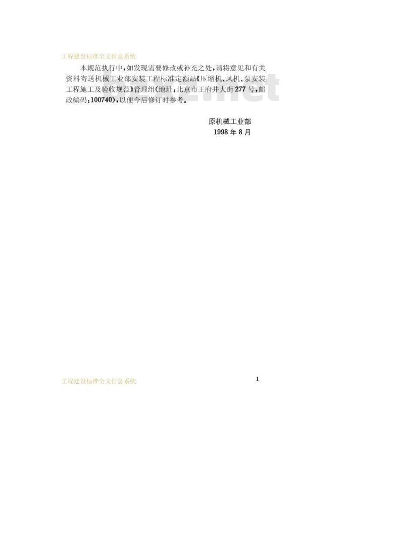 本规范执行中,如发现需要修改或补充之处,请将意见和有关资料寄送机械工业部安装工程标准定额站《压缩机、风机、泵安装工程施工及验收规范》管理组(地址:北京市王府井大街277号,邮政编码:100740),以便今后修订时参考。原机械工业部