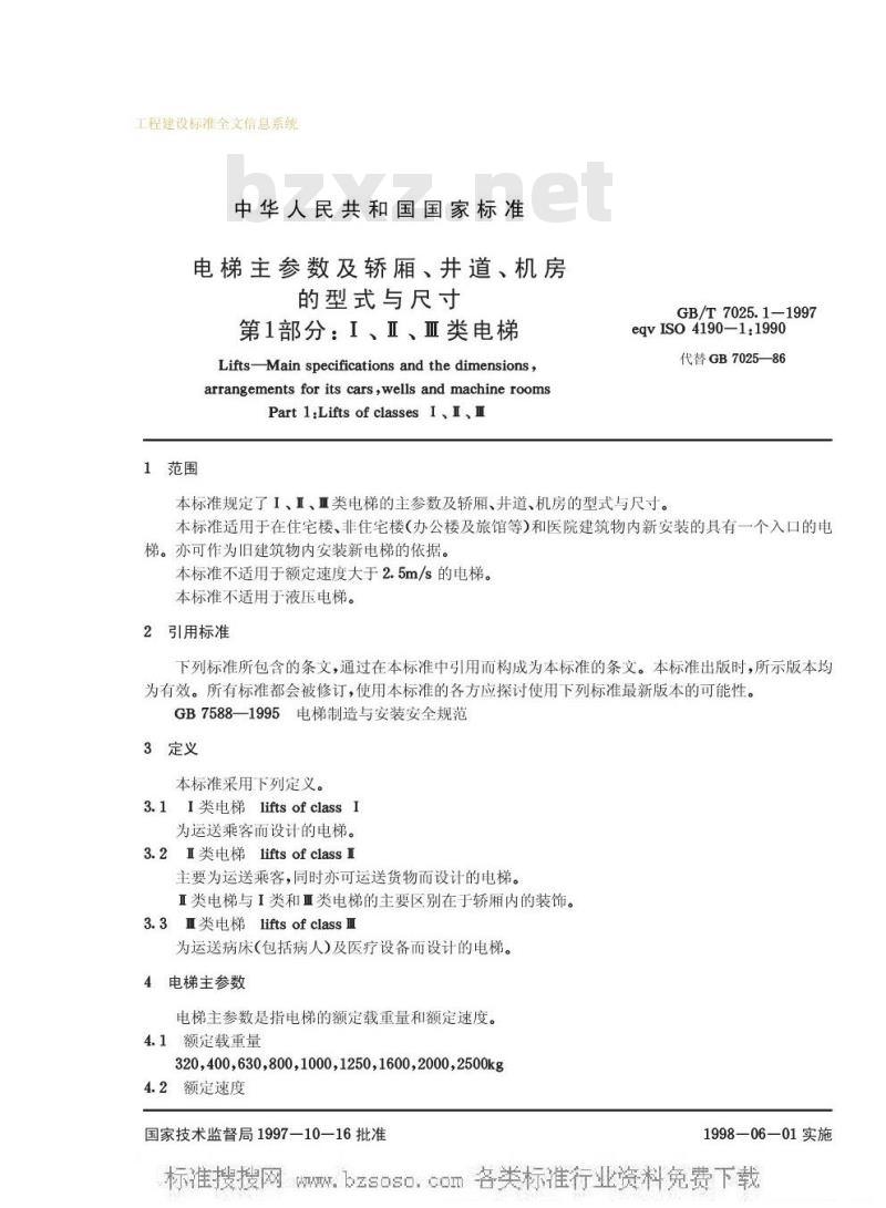 本标准规定了I、II、III类电梯的主参数及轿厢、井道、机房的型式与尺寸。本标准适用于在住宅楼、非住宅楼(办公楼及旅馆等)和医院建筑物内新安装的具有一个入口的电梯。亦可作为旧建筑物内安装新电梯的依据。本标准不适用于额定速度大于2.5 m/s的电梯。本标准不适用于液压电梯。 GB/T 7025.1-1997 电梯主参数及轿厢、井道、机房的型式与尺寸 GB/T7025.1-1997