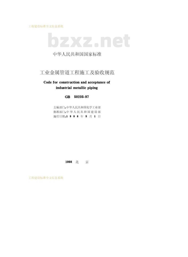 根据国家计委计综合[1991]290号文的要求,由化学工业部会同有关部门共同修订的《工业金属管道工程施工及验收规范》,已经有关部门会审。现批准《工业金属管道工程施工及验收规范》GB50235-97为强制性国家标准,自一九九八年五月一日起施行。原《工业管道工程施工及验收规范》(金属管道篇)(GBJ235-82)同时废止。