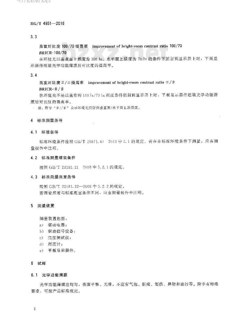 HG/T 4951规定了平板显示器件显示屏用光学功能薄膜的暗室对比度及亮室对比度的测量方法,以及平板显示器件组装光学功能薄膜后暗室对比度提高率及亮室对比度提高率的计算方法。