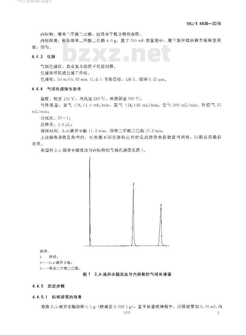 试样用三氯甲烷解。以邻苯二甲酸二已酯为内标物,使用1)B-5 毛细管柱和氧火焰离了化检测器对试群中的2,4-滴异辛酯进行气相色谱分离和测定,以内标法定量,4.4.2试剂和溶液