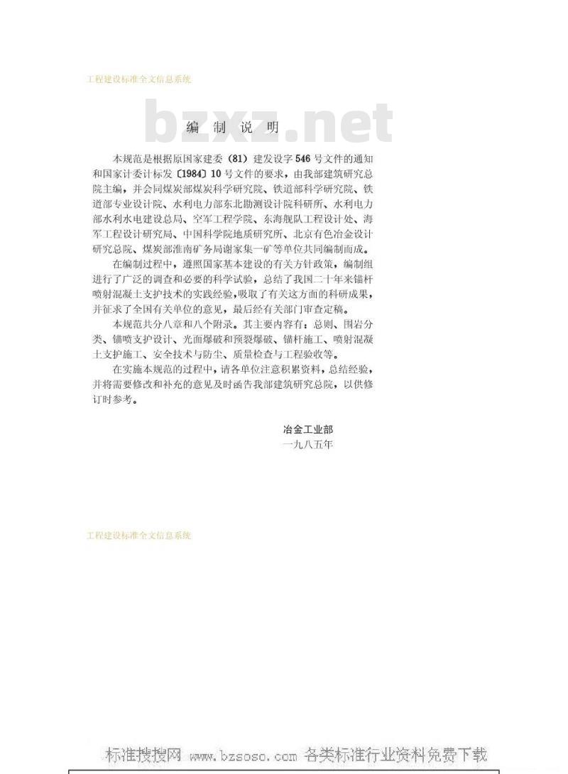 本规范是根据原国家建委(81)建发设字546号文件的通知和国家计委计标发【1984】10号文件的要求,由我部建筑研究总院主编,并会同煤炭部煤炭科学研究院、铁道部科学研究院、铁道部专业设计院、水利电力部东北勘测设计院科研所、水利电力部水利水电建设总局、空军工程学院、东海舰队工程设计处、海军工程设计研究局、中国科学院地质研究所、北京有色冶金设计研究总院、煤炭部淮南矿务局谢家集一矿等单位共同编制而成。在编制过程中,遵照国家基本建设的有关方针政策,编制组进行了广泛的调查和必要的科学试验,总结了我国二十年来锚杆喷射混凝士支护技术的实践经验,吸取了有关这方面的科研成果,并征求了全国有关单位的意见,最后经有关部门审查定稿。本规范共分八章和八个附录。其主要内容有:总则、围岩分类、锚喷支护设计、光面爆破和预裂爆破、锚杆施工、喷射混凝土支护施工、安全技术与防尘、质量检查与工程验收等。在实施本规范的过程中,请各单位注意积累资料,总结经验,并将需要修改和补充的意见及时函告我部建筑研究总院,以供修订时参考。