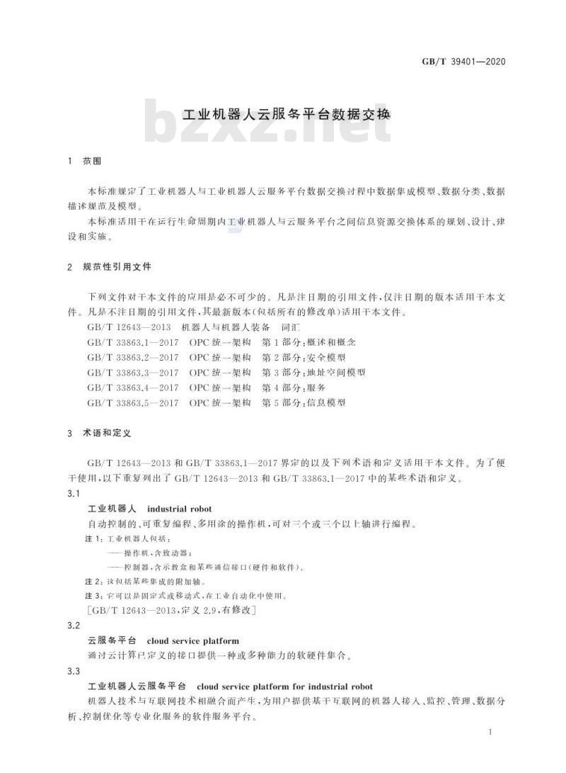 - GB/T 39401-2020 工业机器人云服务平台数据交换