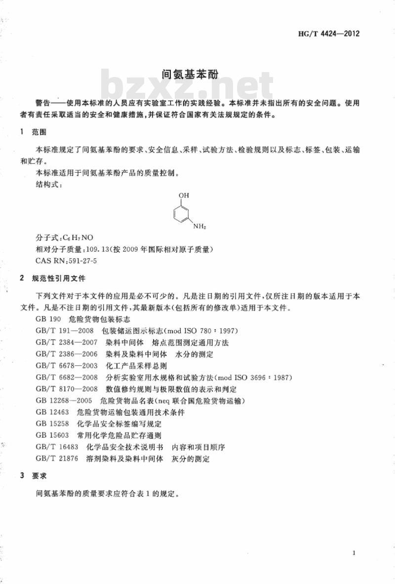 HG/T 4424规定了间氨基苯酚的要求、安全信息、采样、试验方法、检验规则以及标志、标签、包装、运输和贮存。