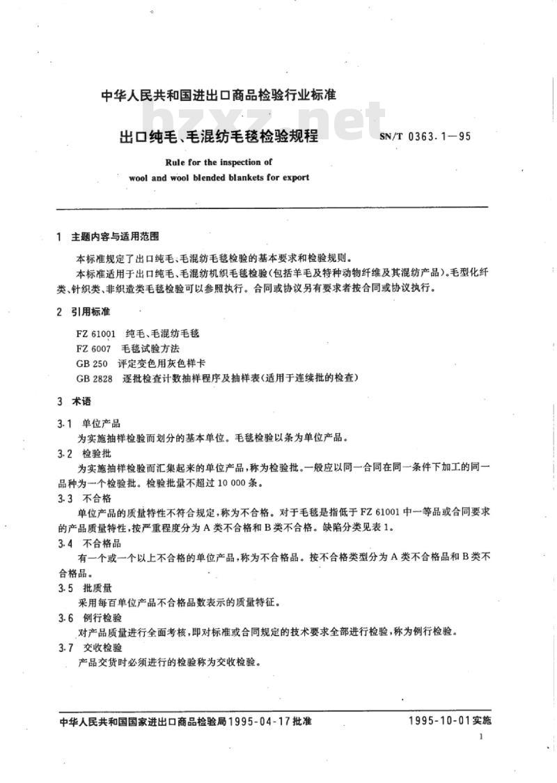 - SN/T 0363.1-95 出口纯毛、毛混纺毛毯检验规程