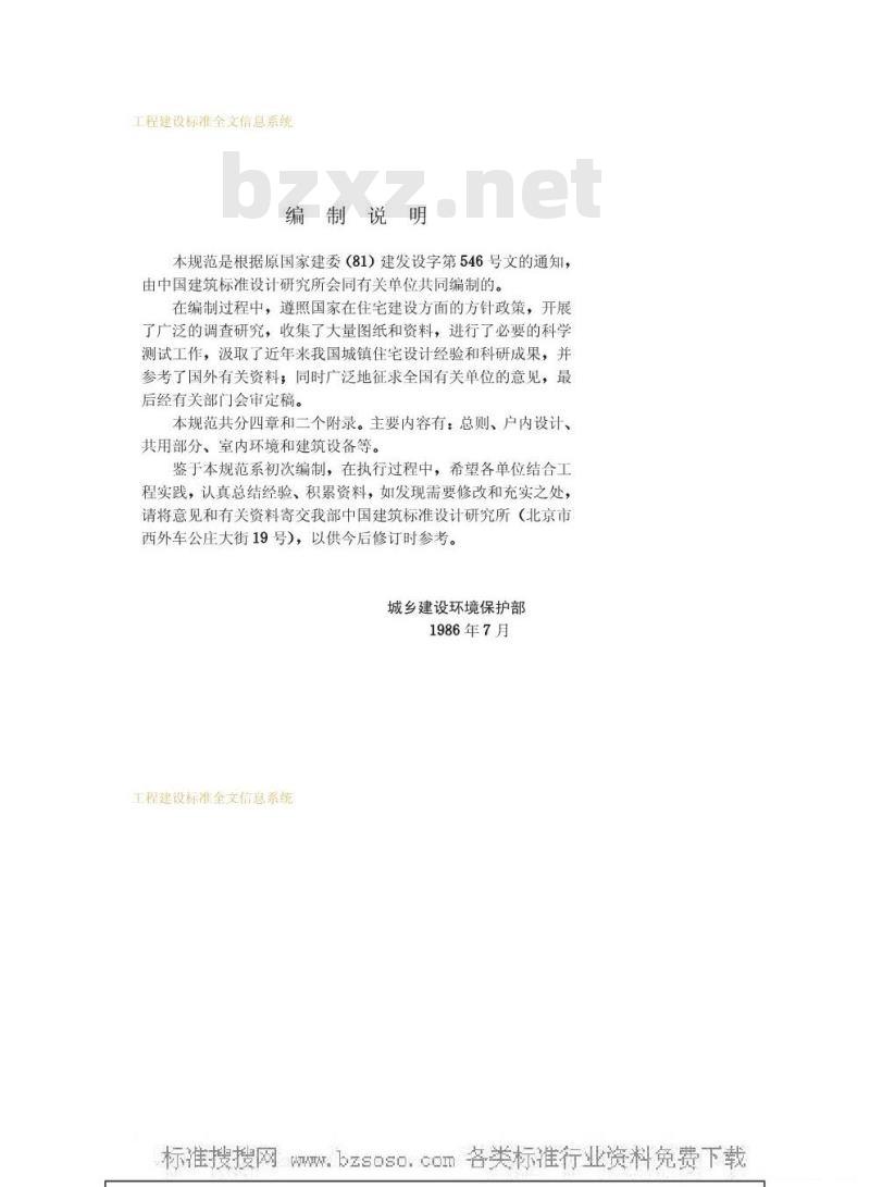 本规范共分四章和二个附录。主要内容有:总则、户内设计、共用部分、室内环境和建筑设备等。鉴于本规范系初次编制,在执行过程中,希望各单位结合工程实践,认真总结经验、积累资料,如发现需要修改和充实之处,请将意见和有关资料寄交我部中国建筑标准设计研究所(北京市西外车公庄大街19号),以供今后修订时参考。城乡建设环境保护部