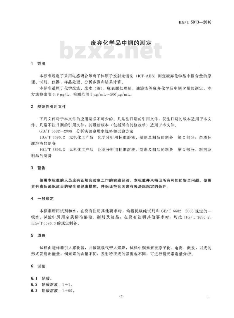 HG/T 5013规定了采用电感耦合等离子体原子发射光谱法(ICP- AES)测定废弃化学品中铜含量的原理、试剂、仪器、样品处理、分析步骤和结果计算。