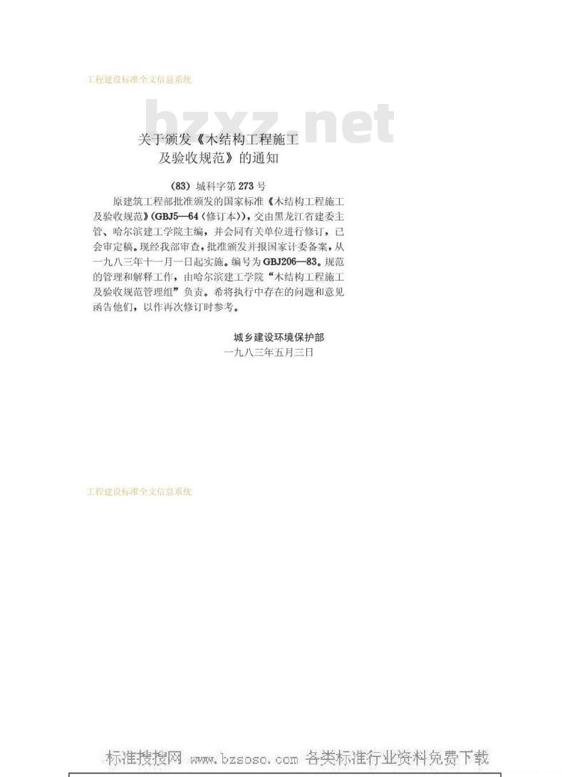 原建筑工程部批准颁发的国家标准《木结构工程施工及验收规范》(GBJ5一64《修订本》),交由黑龙江省建委主管、哈尔滨建工学院主编,并会同有关单位进行修订,已会审定稿。现经我部审查,批准颁发并报国家计委备案,从一九八三年十一月一日起实施。编号为GBJ206一83。规范的管理和解释工作,由哈尔滨建工学院“木结构工程施工及验收规范管理组”负责。希将执行中存在的问题和意见函告他们,以作再次修订时参考。城乡建设环境保护部