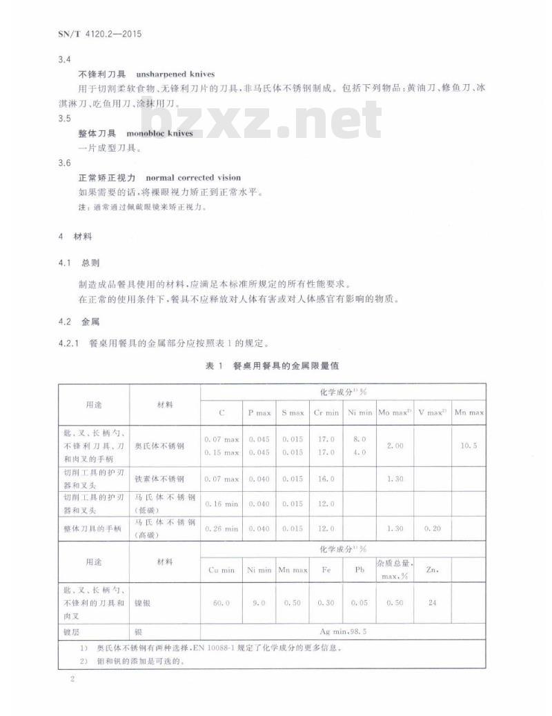 SN/T 4120.2-2015.Export materials and articles in contact with foodstuffs-Cutlery and table holloware-Part 2: Requirements for stainless steel and silver-plated cutlery.