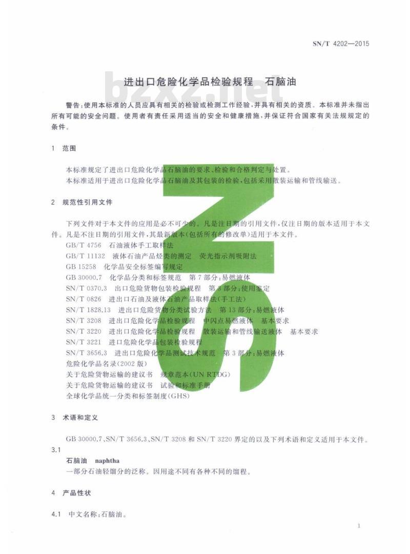石脑油又称粗汽油,为一部分石油轻馏分的泛称,通常为无色或浅黄色液体,有特殊气味。主要用作化肥、乙烯生产和催化重整原料,也可以用于生产溶剂油或作为汽油产品的调和组分。我国石脑油主要产地有辽宁、山东、广东等,进口的主要输出国家有德国、日本等。联合国《关于危险货物运输的建议书规章范本》将石脑油归类为第3类易燃液体,联合国编号为1268。石脑油脱脂能力强,应避免与皮肤接触。大量吸人蒸气能引起神经麻痹国务院2011年3月发布的《危险化学品安全管理条件》[国务院第591号令]规定了检验检疫部门负责对进出口危险化学品及其包装实施检验。为确保检验检疫相关业务工作的有效开展,规范进出口危险化学品及其包装的检验监管工作,制定本标准。进出口危险化学品检验规程