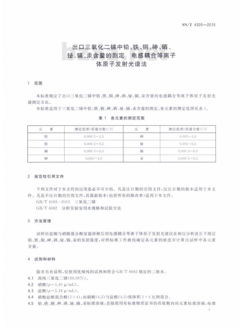 SN/T 4305适用于三氧化二锑中铅、铁、铜、砷、硒、铋、镉、汞含量的测定,各元素的测定范围见表1。