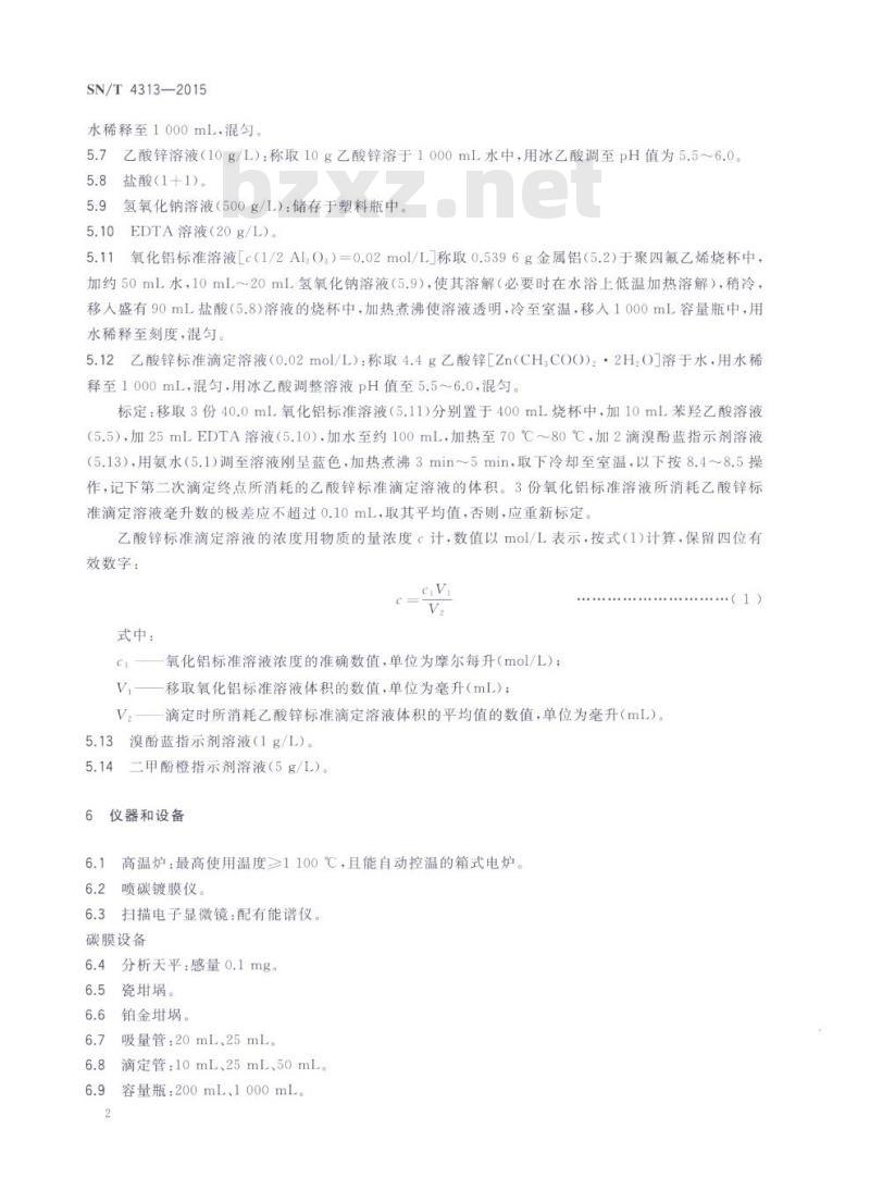 5.12乙酸锌标准滴定溶液(0.02mol/L):称取4.4g乙酸锌[Zn(CH;COO)2·2H,O]溶于水,用水稀释至1000mL,混匀,用冰乙酸调整溶液pH值至5.5~6.0,混匀。标定:移取3份40.0mL氧化铝标准溶液(5.11)分别置于400mL烧杯中,加10mL苯羟乙酸溶液(5.5),加25mLEDTA溶液(5.10),加水至约100mL,加热至70℃~80℃,加2滴溴酚蓝指示剂溶液(5.13),用氨水(5.1)调至溶液刚呈蓝色,加热煮沸3min~5min,取下冷却至室温,以下按8.48.5操作,记下第二次滴定终点所消耗的乙酸锌标准滴定溶液的体积。3份氧化铝标准溶液所消耗乙酸锌标准滴定溶液毫升数的极差应不超过0.10mL,取其平均值,否则,应重新标定。乙酸锌标准滴定溶液的浓度用物质的量浓度c计,数值以mol/L表示,按式(1)计算,保留四位有效数字: