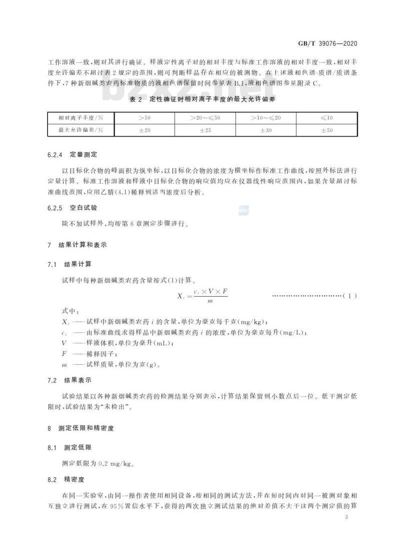 工作溶液一致,则对其进行确证。样液定性离子对的相对丰度与标准工作溶液的相对丰度一致,相对丰度允许偏差不超过表2规定的范围,则可判断样品存在相应的被测物。在上述液相色谱-质谱/质谱条件下,7种新烟碱类农药标准物质的液相色谱保留时间参见表B.1,液相色谱图参见附录C。表2定性确证时相对离子丰度的最大允许偏差相对离子丰度/%