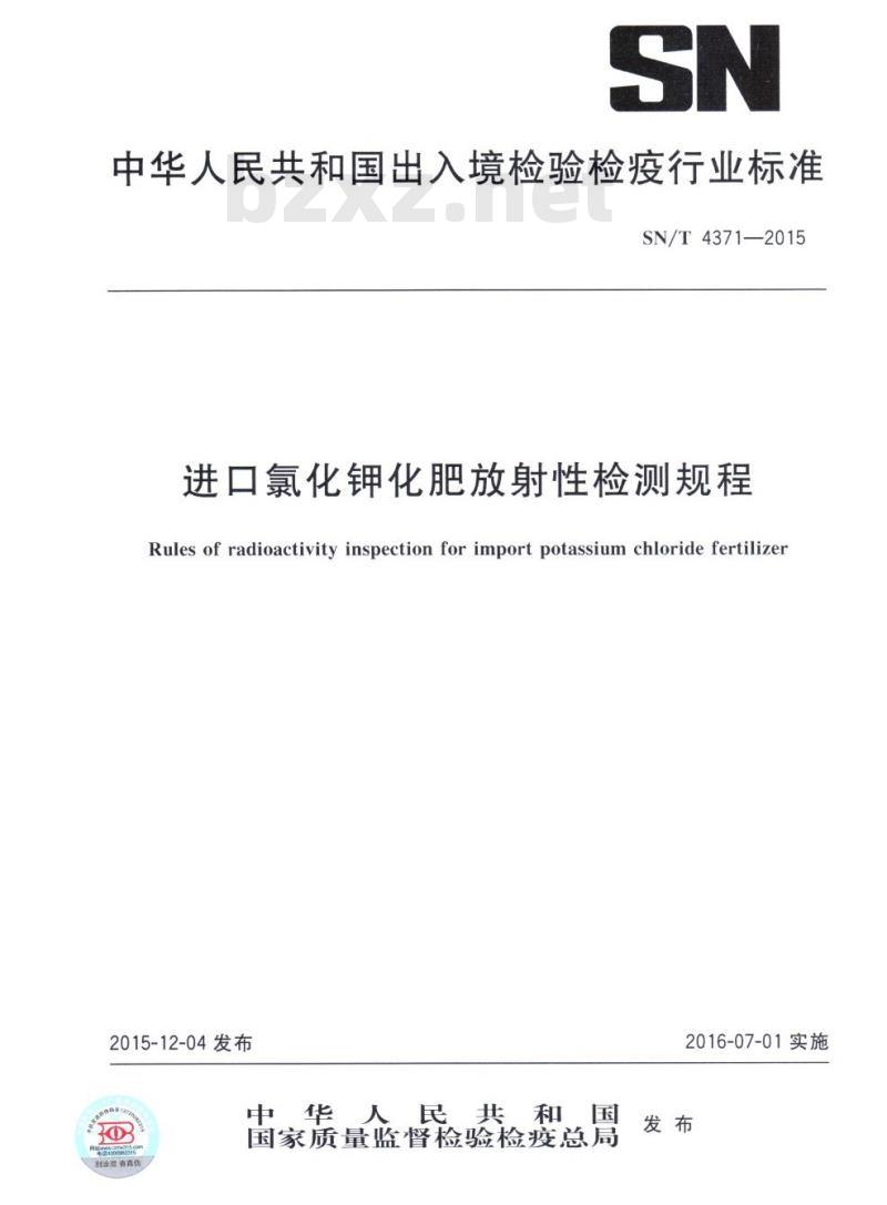 - SN/T 4371-2015 进口氯化钾化肥放射性检测规程