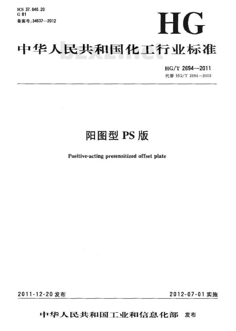 - HG/T 2694-2011 代替 HG/T 2694-2003 阳图型 PS 版