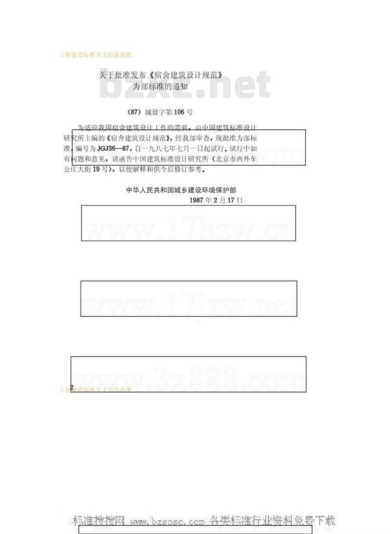 为活应我国宿舍建筑设计工作的需要,中中国建筑标准设计研究所主编的《宿舍建筑设计规范》,经我部审查,现批准为部标准,编号为JGJ36一87,自一九八七年七月一日起试行。试行中如有问题和意见,请函告中国建筑标准设计研究所(北京市西外车公庄大街19号),以便解释和供今后修订参考。中华人民共和国城乡建设环境保护部1987年2月17日