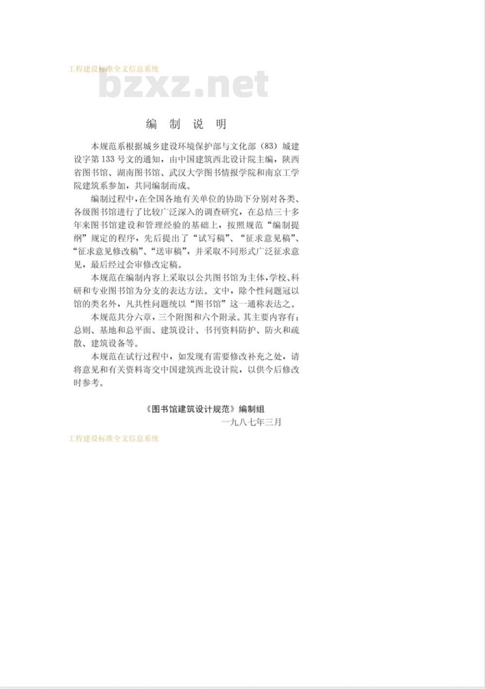 本规范系根据城乡建设环境保护部与文化部(83)城建设字第133号文的通知,由中国建筑西北设计院主编,陕西省图书馆、湖南图书馆、武汉大学图书情报学院和南京工学院建筑系参加,共同编制而成。编制过程中,在全国各地有关单位的协助下分别对各类、各级图书馆进行了比较广泛深入的调查研究,在总结三十多年来图书馆建设和管理经验的基础上,按照规范“编制提纲”规定的程序,先后提出了“试写稿”、“征求意见稿”、“征求意见修改稿”、“送审稿”,并采取不同形式广泛征求意见,最后经过会审修改定稿。