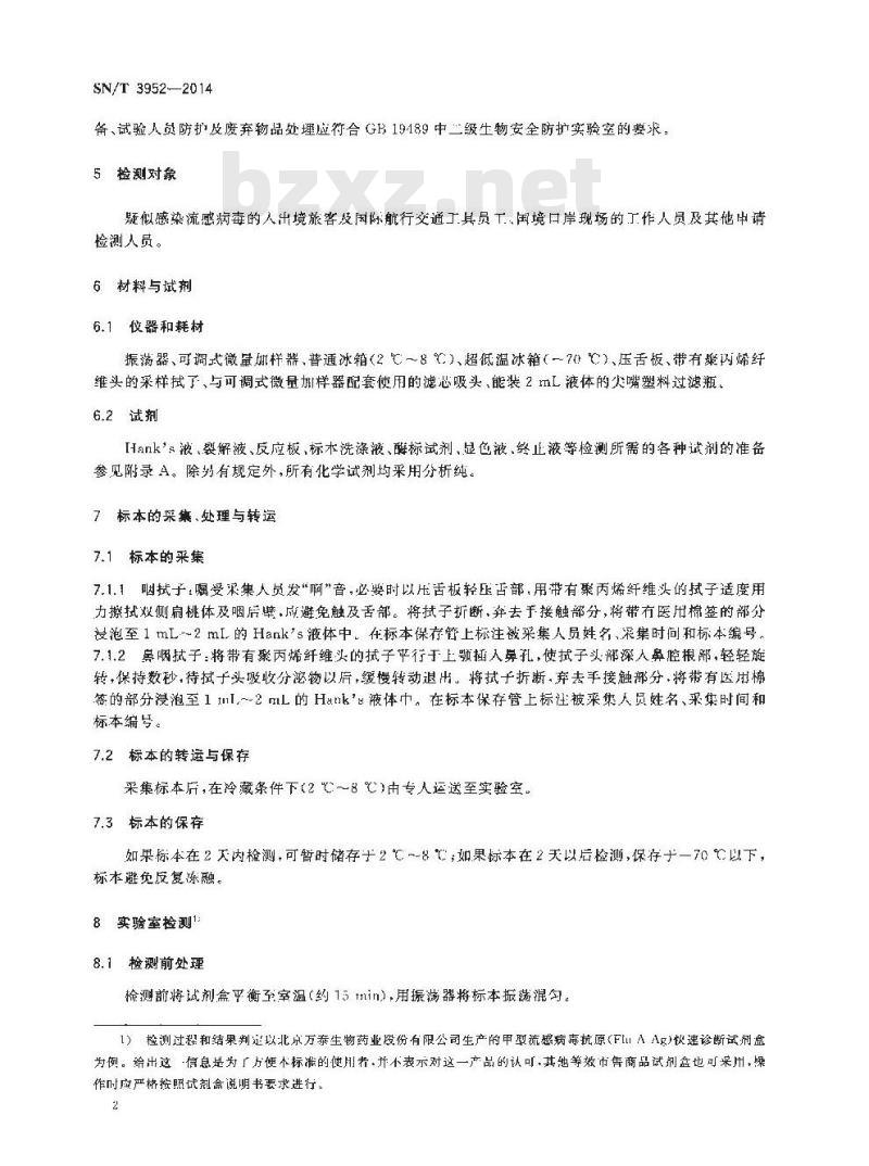 本标准规定了甲型流感病毒的术语和定义、生物安全防护要求、样本的采集与处理、酶联免疫渗滤法的检测步骤、结果判定,检测报告与阳性结果的处置。本标准适用于在国境口岸对人感染甲型流感病毒的检测2规范性引用文件