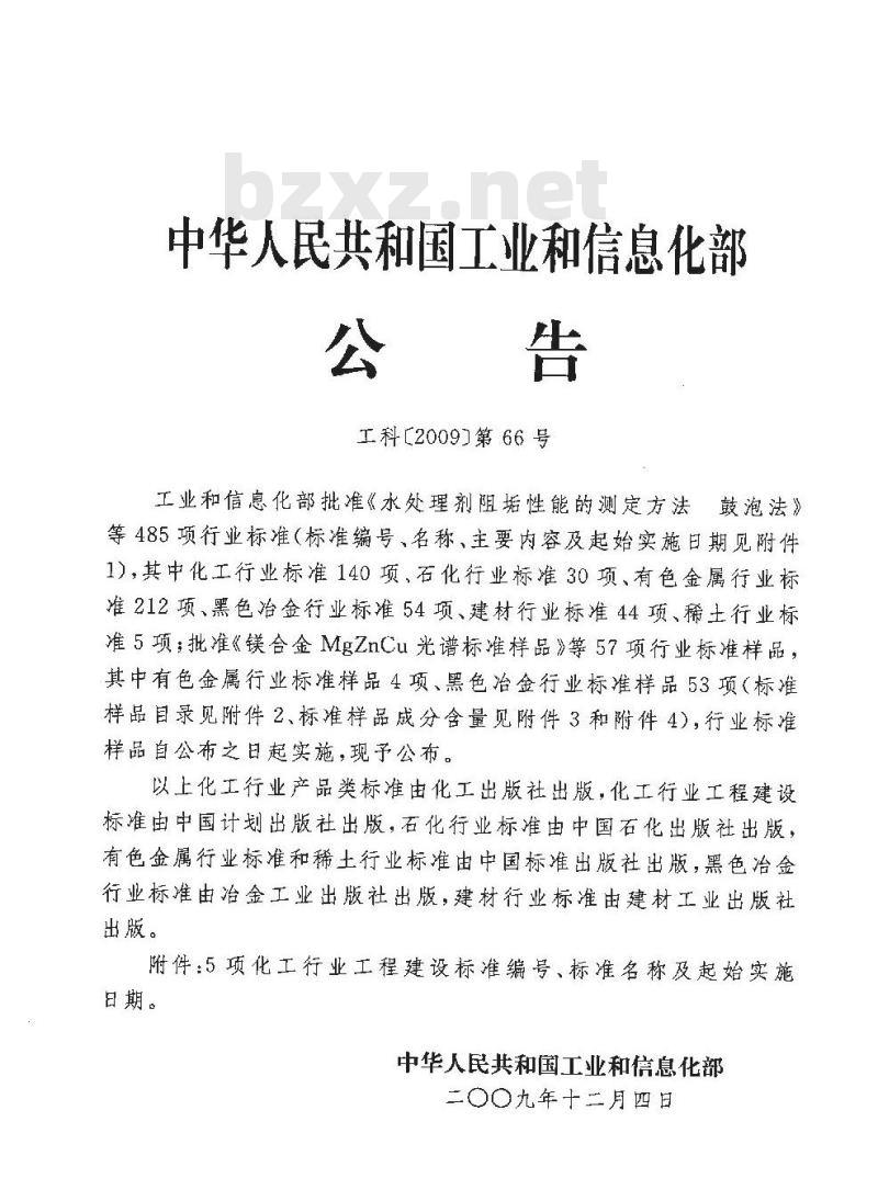 工业和信息化部批准《水处理剂阻垢性能的测定方法鼓泡法》等485项行业标准(标准编号、名称、主要内容及起始实施日期见附件1,其中化工行业标准140项,石化行业标准30项、有色金属行业标准212项、黑色治金行业标准54项、建材行业标准44项、稀土行业标准5项:批准《镁合金MgZnCu光谱标准样品》等57项行业标准样品,其中有色金属行业标准样品4项、黑色治金行业标准样品53项(标准样品目录见附件2、标准样品成分含量见附件3和附件4),行业标准样品自公布之日起实施,现予公布。以上化工行业产品类标准由化工出版社出版,化工行业工程建设标准电中国计划出版社出版,石化行业标准电中国石化出版社出版,有色金属行业标准和稀土行业标准由中国标准出版社出版,黑色冶金行业标准由治金工业出版社出版,建材行业标准由建材工业出版社出版。