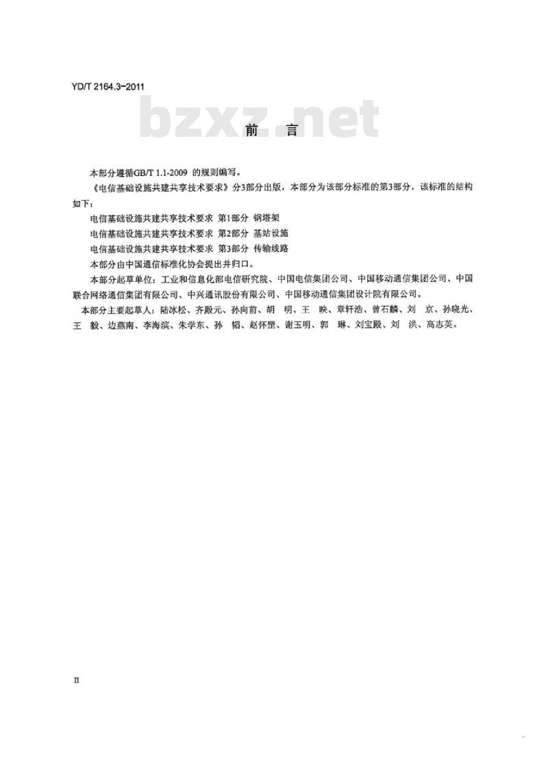 电信基础设施共建共享技术要求第1部分钢塔架电信基础设施共建共享技术要求第2部分基站设施电信基础设施共建共享技术要求第3部分传输线路本部分由中国通信标准化协会提出并归口。本部分起草单位:工业和信息化部电信研究院、中国电信集团公司、中国移动通信集团公司、中国联合网络通信集团有限公司、中兴通讯股份有限公司、中国移动通信集团设计院有限公司。本部分主要起草人:陆冰松、齐殿元、孙向前、胡明、王映、章轩浩、曾石麟、刘京、孙晓光、王毅、边燕南、李海滨、朱学东、孙韬、赵怀罡、谢玉明、郭琳、刘宝殿、刘洪、高志英。1范围