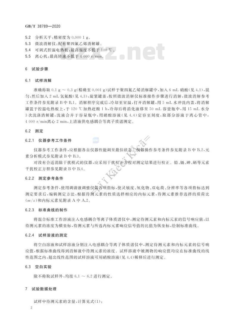 试样经消解后,用电感耦合等离子体质谱仪测定,以元素质荷比(m/)定性,采用外标法,以待测元素质谱信号与内标元素质谱信号的强度比与待测元素的浓度成正比进行定量分析。4试剂或材料