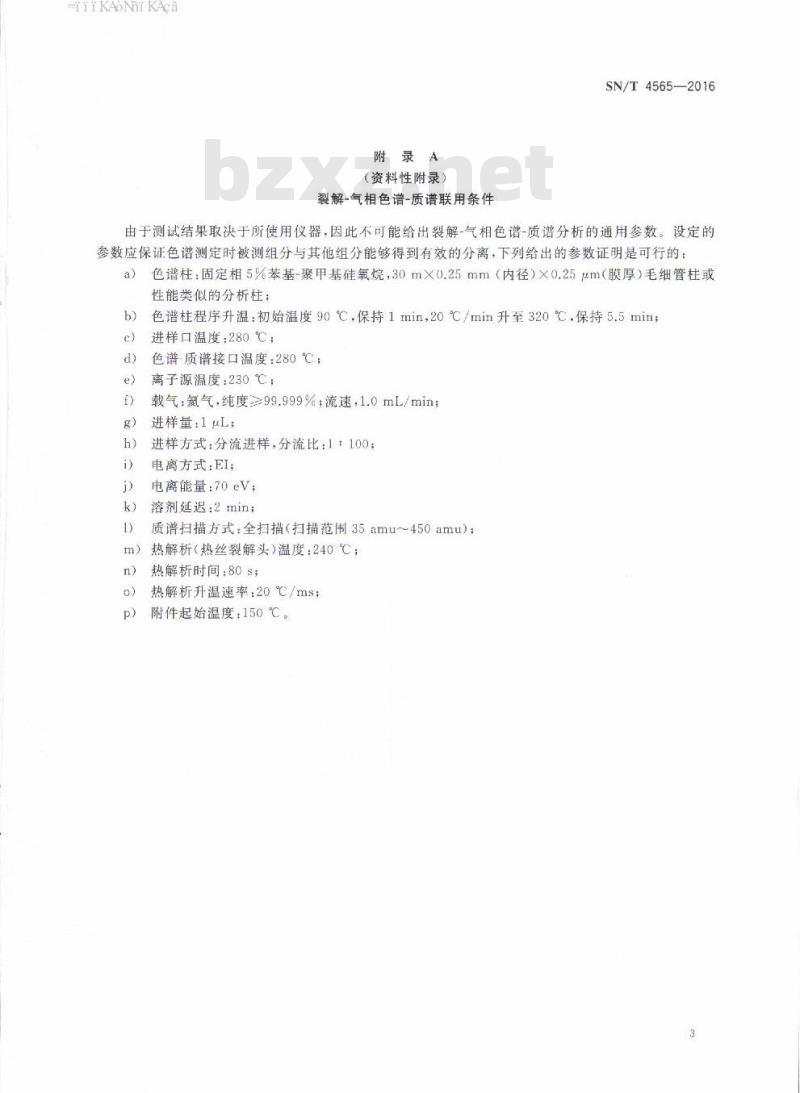 由于测试结果取决于所使用仪器,因此不可能给出裂解-气相色谱-质谱分析的通用参数。设定的参数应保证色谱测定时被测组分与其他组分能够得到有效的分离,下列给出的参数证明是可行的色谱柱:固定相5%苯基-聚甲基硅氧烷,30m×0.25mm(内径)×0.25um(膜厚)毛细管柱或a)