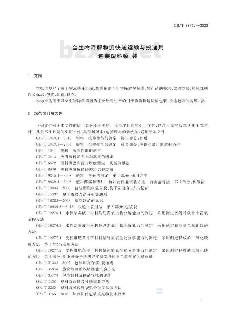 - GB/T 38727-2020 全生物降解物流快递运输与投递用包装塑料膜、袋