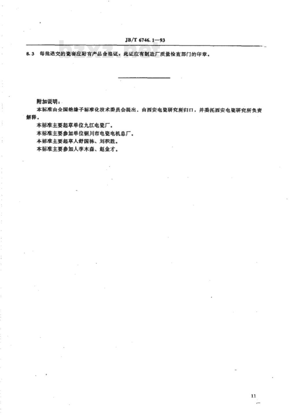本标准主要起草单位九江电瓷厂。本标准主要参加单位铜川市电瓷电机总厂。本标准主要起草人舒国栋、刘积胜。本标准主要参加人李木森、赵金才。