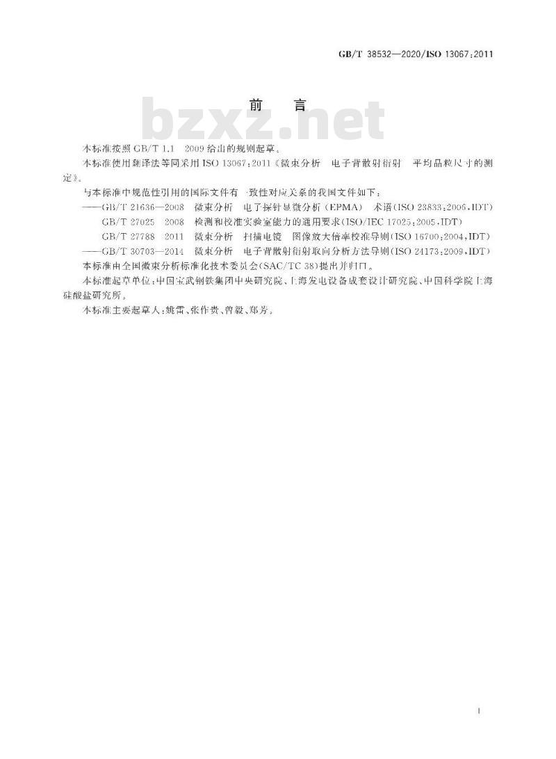 本标准按照GB/T1.12009给出的规则起草。GB/T 38532—2020/1SO13067:2011本标准使用翻译法等同采用IS0130672011《微束分析电子背散射衍射平均品粒尺寸的测与本标准中规范性引用的国际文件有有-致性对成美系的我国文件如下G13/T21636一2008微束分析电了探针显微分析(EPMA)术语(IS023838:2006.1DT)GB/T270252008