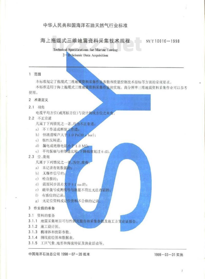 - SY/T 10016-1998 海上拖缆式三维地震资料采集技术规程
