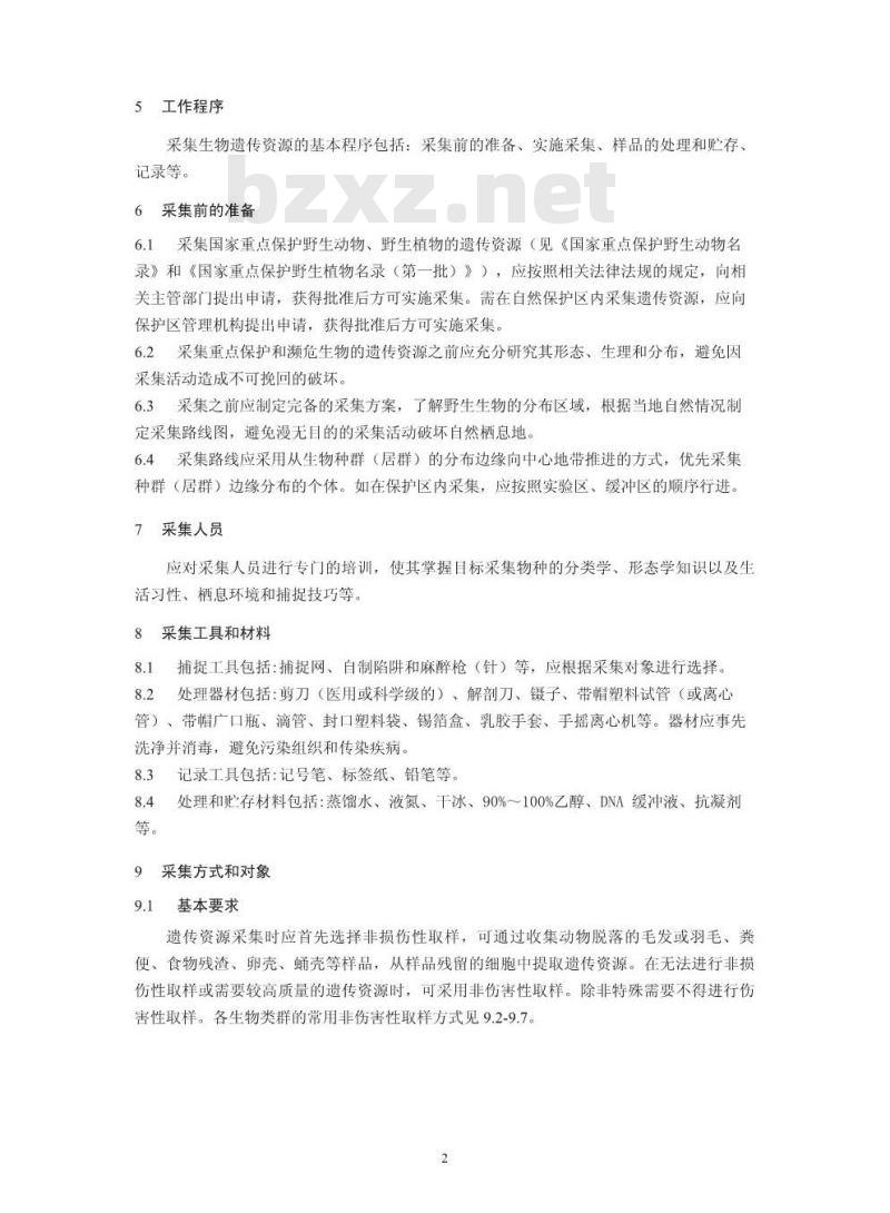 6.1采集国家重点保护野生动物、野生植物的遗传资源(见《国家重点保护野生动物名录》和《国家重点保护野生植物名录(第一批)》),应按照相关法律法规的规定,向相关主管部门提出申请,获得批准后方可实施采集。需在自然保护区内采集遗传资源,应向保护区管理机构提出申请,获得批准后方可实施采集。6.2采集重点保护和濒危生物的遗传资源之前应充分研究其形态、生理和分布,避免达采集活动造成不可挽回的破坏。6.3采集之前应制定完备的采集方案,了解野生生物的分布区域,根据当地自然情况制定采集路线图,避免漫无目的的采集活动破坏自然栖息地。6.4采集路线应采用从生物种群(居群)的分布边缘向中心地带推进的方式,优先采集种群(居群)边缘分布的个体。如在保护区内采集,应按照实验区、缓冲区的顺序行进,7采集人员