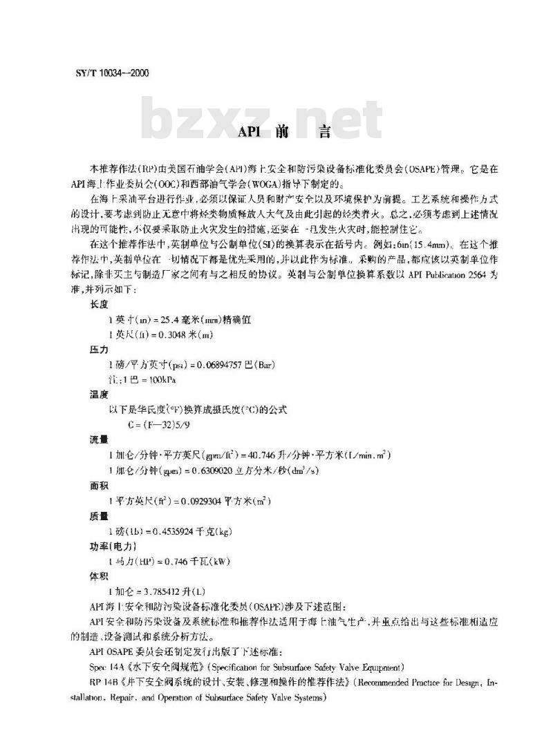 为适应我国海上油气资源开发的需要,尽快与国际接轨,中国海洋石油总公司等同采用美国石油学会APIRP14G《API Recommended Practice for FirePrevention and Control on Open Type Offshore Production Platfoms》1993年版,并对等同采用美国石油学会APIRP14G:1986年版而编制的海洋石油天然气行业标准SY/T4810-92《开式海上生产平台防火与消防的推荐作法》进行修订。根据中国国家质量技术监督局对海洋石油天然气行业标准编号的规定,将本标准的编号改为SY/T10034-2000。在海洋石油天然气开发工程设计、建造和使用本标准时,应考虑涉及到原制定标准所在国政府或其它主管当局的法令、法规和规定等因素。原标准中关于风、浪、流、冰、温度、地震等环境条件数据或定量计算方法,凡切合我国实际的均可参照使用。否则,应研究使用符合我国环境条件的数据和定量计算方法因是等同采用 API标准,为便于使用,故本标准的章节编排、排版格式、文本结构均与原文一致。为不改变原标准中公式、曲线的形状特征、常数和系数,原使用英制单位的,仍沿用英制单位。本标准的计量单位,以公制单位(即我国法定计量单位)为主。也就是公制单位在前,将英制单位和相应量值标在其后的括号内。