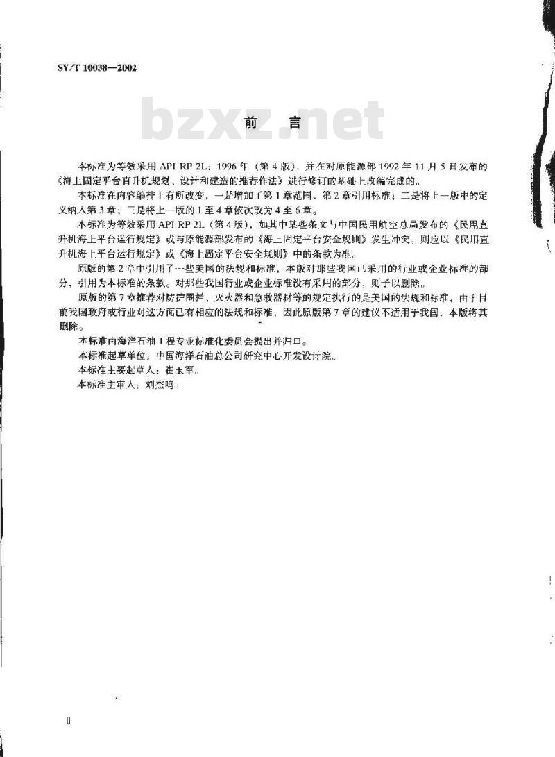 本标准为等效采用APIRP 2L:1996年(第4版,并在对原能源部1992年11月5日发布的《海上固定平台直升机规划、设计和建造的推荐作法》进行修订的基础上收编完版的。本标在内容编排上有所改变,一足增加第1章范用、第2章引用标准:二是将上一版中的定义纳人第3章;一是将上一版的1至4章依次改为4至6章。本标准为等效采APIRP21(第4版),如其中某些条文与中国民用航空总局发布的《民用直升机海上平台运行规定》或与原能源部发布的《海上固定平台安全规则》发生冲突,则应以《民用直升机海上平台运行规定》或《海上固定平台安全规则》中的条款为准。原版的第2商巾引用了-…-些美国的法规和标准,本版对那些我国凹采用的行业或企业标准的部分,引用为本标准的条款。对那些我国行业或企业标难有采用的部分,则予以删除,原版的第7音推荐对防护围栏、灭火器和急救器材等的规定执行的是美国的法规和标准,由于目前我国政府或行业对这方面已有相应的法规和标准,因此原版第7章的建议不适用于我国,本版将其珊除。