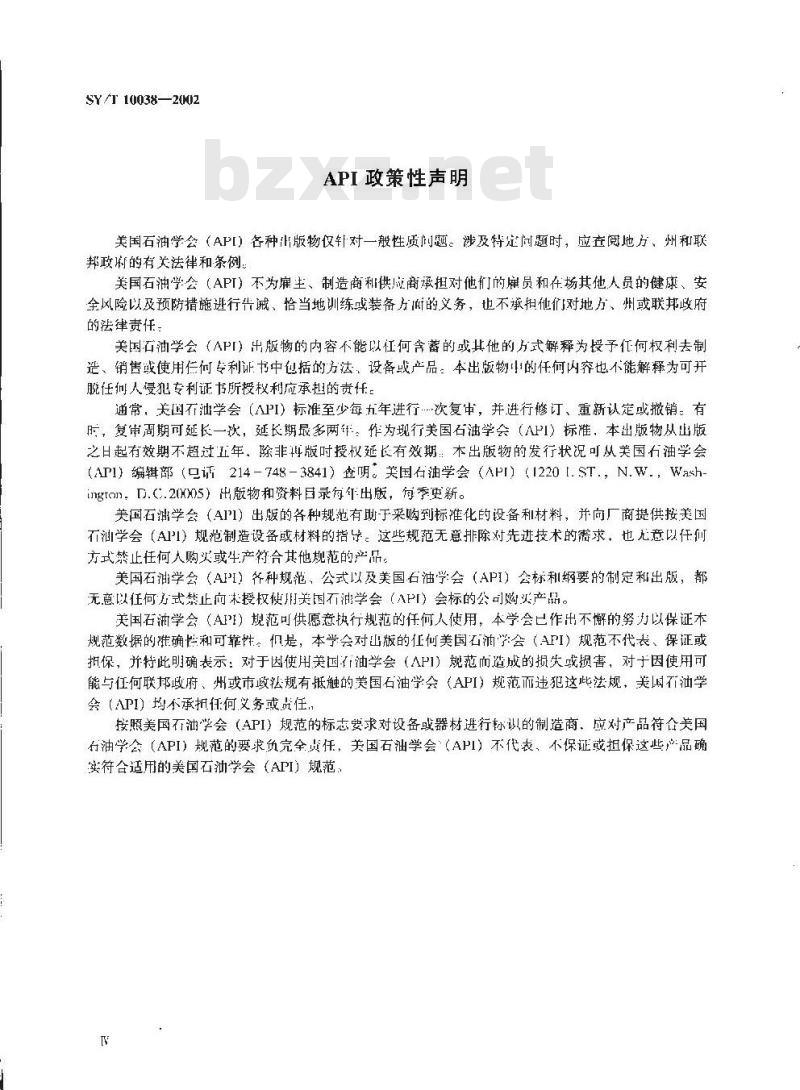 美国石油学会(API)出版物的内容不能以何含蕃的或其他的方式解释为摄予任何权利去制造、销售或使用任何专利证书中包括的方法,设备或产品:本出版物中的任何内容也不能解释为可开脱任例人侵犯专利证书所授权利应承担的责任。通常,关国石汕学会(API)标准至少每九年进行.次复中,并进行修订,重新认定或撤销,有所,复审周期可延长一次,延长期最多两年。作为现行美国石油学会(API)标准,本出版物从出版之日起有效期不超过正年,除非再版时授权延长有效期:本出版物的发行状况可从美国石油学会(API)编辑部(话214-748-3841)奎明。美国右油学会(API)(1220[.ST.,N.W.,Washington,D.C.20xx05)出版物和资料目录每年出版,每季更新。美国石油学会(AIP1)出版的各种规范有助于采购到标准化的设备和材料,并向厂商提供按美国石润学会(AII)规范制造设备或材料的指守。这些规范无意排除对先进技术的需求,也无意以任间方式禁止任何人购火或生产符合其他规范的产品。美国石油学会(API)各种规范、公式以及美国石油学会(API)会标和纲要的制定和出版,都无意以任何方式禁止向未授权使用关国石油学会(API)会标的公司购买产品。美国石学会(AII)规范可供愿意执行规范的任何人使用,本学会已作出不的努力以保证木规范数据的准确性和可靠性。仅是,本学会对出版的任何美国石油学会(API)规范不代表、保证或担保,并特此明确表示:对于因使用美国油学会(API)规范而造成的损失或损害,对于因使用可能与任何联邦政府、州或市政法规有抵触的美国石油学会(API)规范而违犯这些法规,美国石油学会(API)均不承扭任何义务或任,按照美国石油学会(API)规范的标志要求对设备或器材进行标认的制造商应对产品符合美国右油学会(API)规范的要求负完全货任,美国石油学会(API)不代表,不保证鼓担保这些产品确实符合适用的美国石油学会(API)规范:1范围
