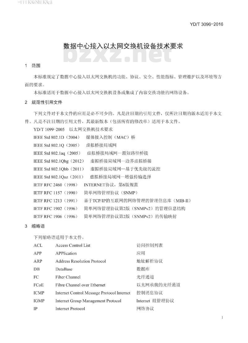 YD/T 3096规定了数据中心接入以太网交换机的功能、协议、安全、性能指标、管理维护以及环境等方面的要求。